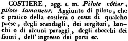 | Costiere - agg. s. m. Pilote còtier, pilote lamaneur. Aggiunto di piloto, che è pratico della costiera o coste di qualche paese, degli scandagli, dei sorgitori, banchi o di alcuni paraggi, degli sbocchi dei fiumi, dell'ingresso dei porti ec. [immagine] |