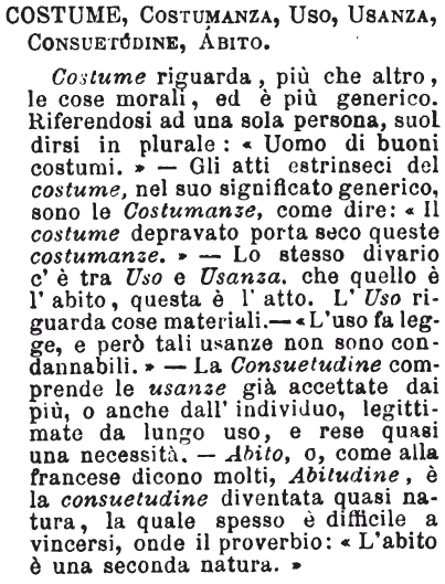 | Avere in costume, Per costume, Essere di costume, Esser costume - «Chi ha in costume fa qualche volta: chi ha per costume fa sempre o quasi sempre; par che non possa non fare. E' di costume è meno che se dicessi: è costume». Neri. [immagine] |