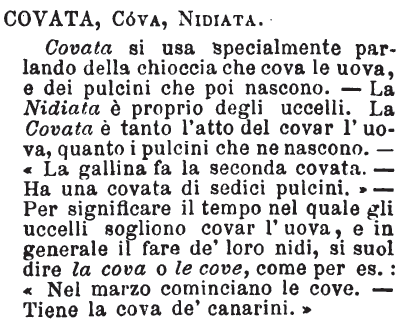 | Covata, Cova, Nidiata - Covata si usa specialmente parlando della chioccia che cova le uova, e dei pulcini che poi nascono. - La Nidiata è proprio degli uccelli. la Covata è tanto l'atto del covar l'uova, quanto i pulcini che ne nascono. - « La gallina fa la seconda covata. - Ha una covata di sedici pulcini. » - Per significare il tempo nel quale gli uccelli sogliono covar l'uova, e in generale il fare de' loro nidi, si suol dire la cova o le cove, come per es.: « Nel marzo cominciano le cove. - Tiene la cova de' canarini. » [immagine] |