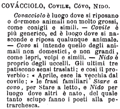 | Covacciolo, Covile, Covo, Nido - Covacciolo è luogo dove si riposano o dormono animali non molto grossi, come conigli e simili. - Covile è più generico, ed è il luogo dove si nasconde e riposa qualunque animale. - Covo si intende quello degli animali non domestici, e non grandi, come lepri, volpi e simili. - Nido è proprio degli uccelli. Gli ultimi tre patiscono sensi traslati; e così il proverbio: « Aprile, esce la vecchia dal covile; » le frasi familiari Stare a covo, per Stare a letto, e Nido per luogo dove altri è nato, del quale tanto sciupo fanno i poeti alla petrarchesca. [immagine] |