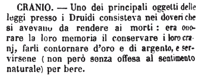 | Cranio - Uno dei principali oggetti delle leggi presso i Druidi consisteva nei doveri che si avevano da rendere ai morti: era onorare la loro memoria il conservare i loro cranj, farli contornare d'oro e di argento, e servirsene (non però senza offesa al sentimento naturale) per bere. [immagine] |