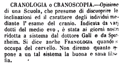 | Cranologia o Cranoscopia - Opinione di una Scuola, che presume di discuoprire le inclinazioni ed il carattere degli individui mediante l'esame del cranio. Indicata da varj dotti del medio evo, è stata ai giorni nostri ridotta a sistema dal dottore Gall e da Spurzheim. Si dice anche Frenologia quando si occupa del cervello. Non diremo quanto espone a un tal sistema la buona e sana filosofia. [immagine] |