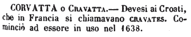 | Corvatta o cravatta - Devesi ai Croati, che in Francia si chiamavano cravates. Cominciò ad essere in uso nel 1638. [immagine] |