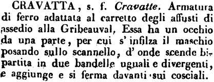 | Cravatta - s. f. Cravatte. Armatura di ferro adattata al carretto degli affusti di assedio alla Gribeauval. Essa ha un occhio da una parte, per cui s'infilza il maschio posando sullo scannello, d'onde scende bipartita in due bandelle uguali e divergenti, e aggiunge e si ferma davanti sui cosciali. [immagine] |