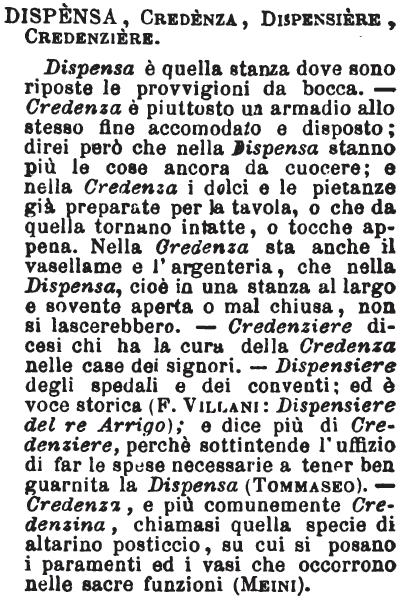 Dispensa, Credenza; Dispensiere, Credenziere - Dispensa è quella camera dove sono riposte le provvigioni da bocca; credenza è piuttosto un armadio allo stesso fine accomodato e disposto; direi però che nella dispensa stanno più le cose ancora da cuocere; e nella credenza, i piatti e pietanze già preparati per la tavola, o che da quella tornano intatte o tocche appena. Nella credenza sta anche il vasellame e l'argenteria, che nella dispensa, cioè in una camera al largo e sovente aperta o mal chiusa, non si lascerebbero.