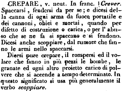 Crepare - v. neut. In franc. Crever. Spaccarsi, fendersi da per se; e dicesi della canna di ogni arma da fuoco portatile e dei cannoni, obici e mortai, quando per difetto di costruzione o carica, o per l'abuso che se ne fa si spaccano e si fendono. Dicesi anche scoppiare, dal rumore che fanno le armi nello spaccarsi.