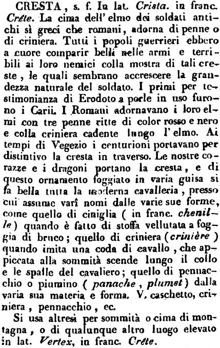 | Cresta - s. f. In lat. Crista. in franc. Crête. La cima dell'elmo dei soldati antichi sì greci che romani, adorna di penne o di criniera. Tutti i popoli guerrieri ebbero a cuore comparir belli nelle armi e terribili ai loro nemici colla mostra di tali creste, le quali sembrano accrescere la grandezza naturale del soldato. I primi per testimonianza di Erodoto a porle in uso furono i Carii. I Romani adornavano i loro elmi con tre penne ritte di color rosso e nero e colla criniera cadente lungo l'elmo. Ai tempi di Vegezio i centurioni portavano per distintivo la cresta in traverso. Le nostre corazze e i dragoni portano la cresta, e di questo ornamento foggiato in varia guisa si fa bella tutta la moderna cavalleria, presso cui assume varî nomi dalle varie sue forme, come quello di ciniglia (in franc. chenille) quando è fatto di stoffa vellutata a foggia di bruco; quello di criniera (crinière) quando imita una coda di cavallo, che appiccata alla sommità scende lungo il collo e le spalle del cavaliero; quello di pennacchio o piumino (panache, plumet) dalla varia sua materia e forma. V. caschetto, criniera, pennacchio, ec.