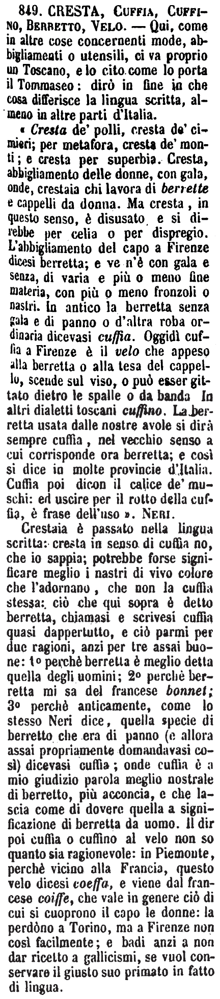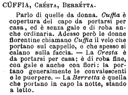 | Cresta, Cuffia, Cuffino, Berretto, Velo - Qui, come in altre cose concernenti mode, abbigliamenti o utensili, ci va proprio un Toscano, e lo cito come lo porta il Tommaseo: dirò in fine in che cosa differisce la lingua scritta, almeno in altre parti d'Italia.