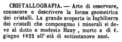 | Cristallografia - Arte di osservare, conoscere e descrivere la forma geometrica dei cristalli. La grande scoperta in Inghilterra dei cristalli che compongono i minerali si deve al dotto e modesto Hauy, morto a dì 1. giugno 1822 all'età di settantanove anni. [immagine] |