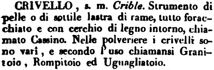| Crivello - s. m. Crible. Strumento di pelle o di sottile lastra di rame, tutto foracchiato e con cerchio di legno intorno, chiamato Cassino. Nelle polveriere i crivelli sono vari, e secondo l'uso chiamansi Granitoio, Rompitoio ed Uguagliatoio. [immagine] |