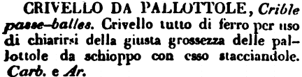| Crivello da pallottole - Crible passe-balles. Crivello tutto di ferro per uso di chiarirsi della giusta grossezza delle pallottole da schioppo con caso stacciandole. Carb. e Ar. [immagine] |