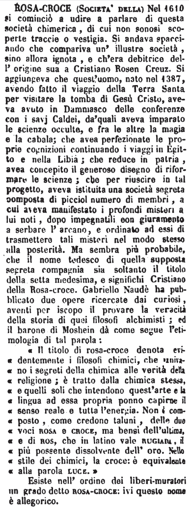 | Rosa-croce - (Società della) Nel 1610 si cominciò a udire a parlare di questa società chimerica, di cui non sonosi scoperte traccie o vestigia. Si andava spacciando che compariva un'illustre società, sino allora ignota, e ch'era debitrice dell'origine sua a Cristiano Rosen Creuz. Si aggiungeva che quest'uomo, nato nel 1387, avendo fatto il viaggio della Terra Santa per visitare la tomba di Gesù Cristo, aveva avuto in Dammasco delle conferenze con i savj Caldei, da' quali aveva imparato le scienze occulte, e fra le altre la magia e la cabala; che avea perfezionate le proprie cognizioni continuando i viaggi in Egitto e nella Libia; che reduce in patria, avea concepito il generoso disegno di riformare le scienze; che per riuscire in tal progetto, aveva istituita una società segreta composta di picciol numero di membri, a cui aveva manifestato i profondi misteri a lui noti, dopo impegnatili con giuramento a serbare l'arcano, e ordinato ad essi di trasmettere tali misteri nel modo stesso alla posterità. Ma sembra più probabile, che il nome tedesco di quella supposta segreta compagnia sia soltanto il titolo della setta medesima, e significhi Cristiano della Rosa-croce. Gabriello Naudè ha pubblicato due opere ricercate dai curiosi, aventi per iscopo il provare la veracità della storia di quei filosofi alchimisti; ed il barone di Moshein dà come segue l'etimologia di tal parola: