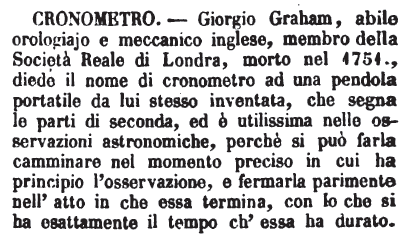 | Cronometro - Giorgio Graham, abile orologiajo e meccanico inglese, membro della Società Reale di Londra, morto nel 1754., diede il nome di cronometro ad una pendola portatile da lui stesso inventata, che segna le parti di seconda, ed è utilissima nelle osservazioni astronomiche, perchè si può farla camminare nel momento preciso in cui ha principio l'osservazione, e fermarla parimente nell'atto in che essa termina, con lo che si ha esattamente il tempo ch'essa ha durato. [immagine] |