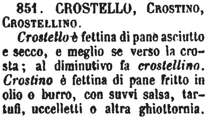 | Crostello, Crostino, Crostellino - Crostello è fettina di pane asciutto e secco, e meglio se verso la crosta; al diminutivo fa crostellino. Crostino è fettina di pane fritto in olio o burro, con suvvi salsa, tartufi, uccelletti o altra ghiottornìa. [immagine] |