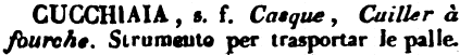 | Cucchiaia - s. f. Casque, Cuiller à fourche. Strumento per trasportar le palle. [immagine] |