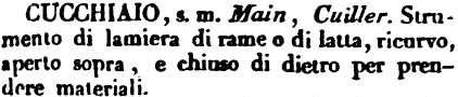 | Cucchiaio - s. m. Main, Cuiller. Strumento di lamiera di rame o di latta, ricurvo, aperto sopra, e chiuso di dietro per prendere materiali. [immagine] |