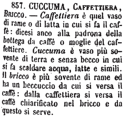 | Cuccuma, Caffettiera, Bricco - Caffettiera è quel vaso di rame o di latta in cui si fa il caffè: dicesi anco alla padrona della bottega da caffè o moglie del caffettiere. Cuccuma è vaso più sovente di terra e senza becco in cui si fa scaldare acqua, latte e simili. Il bricco è più sovente di rame ed ha un beccuccio da cui si versa il caffè: dalla caffettiera si versa il caffè chiarificato nel bricco e da questo si serve. [immagine] |