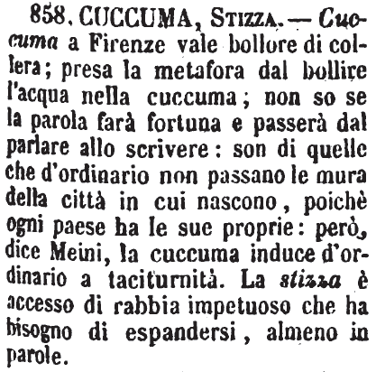 | Cuccuma, Stizza - Cuccuma a Firenze vale bollore di collera; presa la metafora dal bollire l'acqua nella cuccuma; non so se la parola farà fortuna e passerà dal parlare allo scrivere: son di quelle che d'ordinario non passano le mura della città in cui nascono, poichè ogni paese ha le sue proprie: però, dice Meini, la cuccuma induce d'ordinario a taciturnità. La stizza è accesso di rabbia impetuoso che ha bisogno di espandersi, almeno in parole. [immagine] |