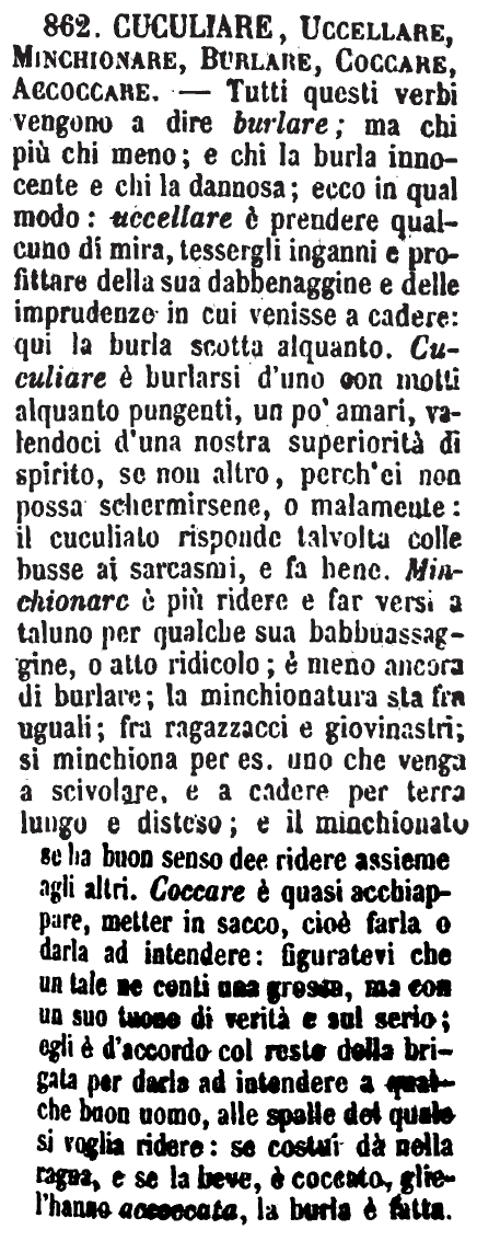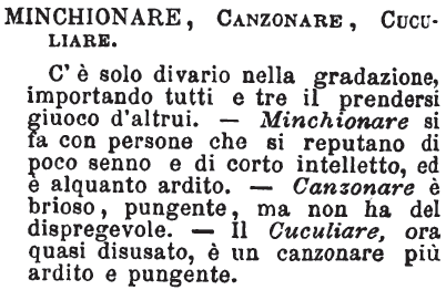 | Minchionare, Canzonare, Cuculiare - C'è solo divario nella gradazione, importando tutti e tre il prendersi giuoco d'altrui. - Minchionare si fa con persone che si reputano di poco senno e di corto intelletto, ed è alquanto ardito. - Canzonare è brioso, pungente, ma non ha del dispregevole. - Il Cuculiare, ora quasi disusato, è un canzonare più ardito e pungente. [immagine] |