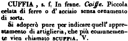 | Cuffia - s. f. In franc. Coiffe. Piccola celata di ferro o d'acciaio senza ornamento di sorta.