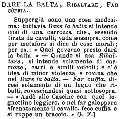| Dare la balta, Ribaltare, Far cuffia - Suppergiù sono una cosa medesima: tuttavia Dare la balta si intende così di una carrozza che, essendo tirata da cavalli, vada sossopra, come per metafora si dice di cose morali; per es.: « Quel governo presto darà la balta. » - Quando si usa Ribaltare, si intende solamente di carrozze, carri e simili veicoli; e c'è idea di minor violenza e rovina che nel Dare la balta. - [Far cuffia, dicesi solamente di un legno che ribalti, rovesciandosi quasi sottosopra. - « Andò alle Cascine con quel legnettino leggiero, e nel far galoppare sfrenatamente il cavallo, fece cuffia e si ruppe un braccio. » G. F.] [immagine] |