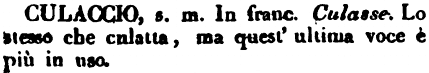 | Culaccio - s. m. In franc. Culasse. Lo stesso che culatta, ma quest'ultima voce è più in uso. [immagine] |