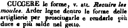 | Cuocere - le forme, v. att. Recuire les moules. Arder legne dentro le forme delle artiglierie per prosciugarle e renderle più dure e più salde nel getto. [immagine] |