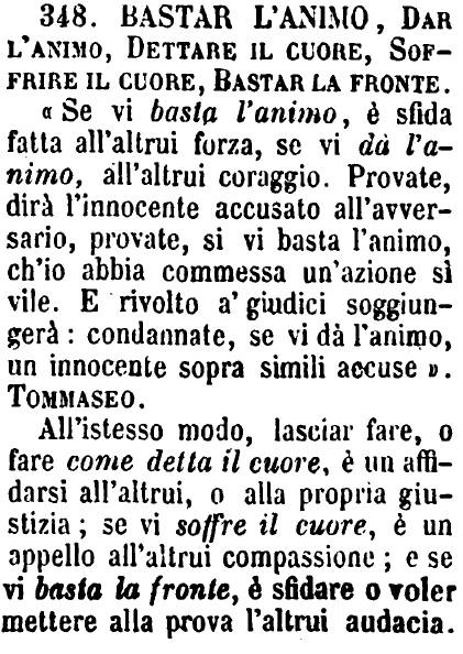 Bastar l’animo, Dar l’animo, Dettare il cuore, Soffrire il cuore, Bastar la fronte - «Se vi basta l'animo, è sfida fatta all'altrui forza, se vi dà l'animo, all'altrui coraggio. Provate, dirà l'innocente accusato all'avversario, provate, si vi basta l'animo, ch'io abbia commessa un'azione sì vile. E rivolto a' giudici soggiungerà: condannate, se vi dà l'animo, un innocente sopra simili accuse». Tommaseo.