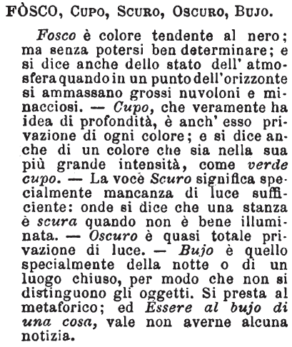 | Fosco, Cupo, Scuro, Oscuro, Bujo - Fosco è colore tendente al nero; ma senza potersi ben determinare; e si dice anche dello stato dell'atmosfera quando in un punto dell'orizzonte si ammassano grossi nuvoloni e minacciosi. - Cupo, che veramente ha idea di profondità, è anch'esso privazione di ogni colore; e si dice anche di un colore che sia nella sua più grande intensità, come verde cupo. - La voce Scuro significa specialmente mancanza di luce sufficiente: onde si dice che una stanza è scura quando non è bene illuminata. - Oscuro è quasi totale privazione di luce. - Bujo è quello specialmente della notte o di un luogo chiuso, per modo che non si distinguono gli oggetti. Si presta al metaforico; ed Essere al bujo di una cosa, vale non averne alcuna notizia. [immagine] |