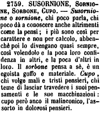 | Susornione, Sornione, Sorbone, Cupo - Susornione o sornione, chi poco parla, chi poco dà a conoscere anche altrimenti come la pensi; i più sono così per carattere e non per calcolo, abbenchè poi lo divengano quasi sempre, così volendolo e la poca loro confidenza in altri, e la poca d'altri in loro. Il sorbone pensa a sè, è un egoista goffo e materiale. Cupo, chi volge mali e tristi pensieri, chi teme di lasciar travedere i suoi pensamenti e le sue macchinazioni: cupo però anco il malinconico, l'assorto in dolorosi pensieri. [immagine] |
