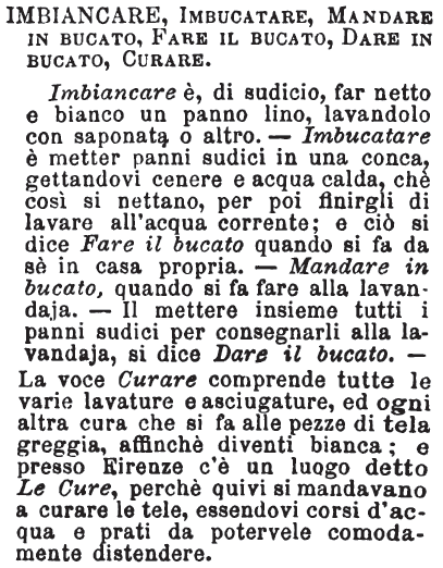 | Imbiancare, Imbucatare, Mandare in bucato, Fare il bucato, Dare in bucato, Curare - Imbiancare è, di sudicio, far netto e bianco un panno lino, lavandolo con saponata o altro. - Imbucatare è metter panni sudici in una conca, gettandovi cenere e acqua calda, chè così si nettano, per poi finirgli di lavare all'acqua corrente; e ciò si dice Fare il bucato quando si fa da sè in casa propria. - Mandare in bucato, quando si fa fare alla lavandaja. - Il mettere insieme tutti i panni sudici per consegnarli alla lavandaja, si dice Dare il bucato. - La voce Curare comprende tutte le varie lavature e asciugature, ed ogni altra cura che si fa alle pezze di tela greggia, affinchè diventi bianca; e presso Firenze c'è un luogo detto Le Cure, perchè quivi si mandavano a curare le tele, essendovi corsi d'acqua e prati da potervele comodamente distendere. [immagine] |