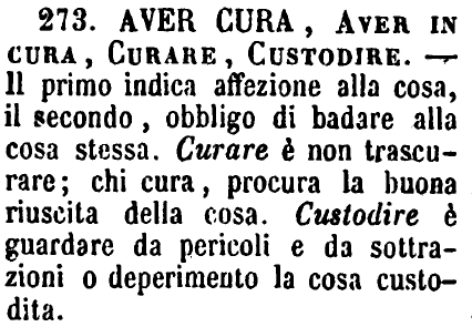 | Aver cura, Aver in cura, Curare, Custodire - Il primo indica affezione alla cosa, il secondo, obbligo di badare alla cosa stessa. Curare è non trascurare; chi cura, procura la buona riuscita della cosa. Custodire è guardare da pericoli e da sottrazioni o deperimento la cosa custodita. [immagine] |