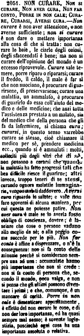 | Non curare, Non si curare, Non aver cura, Non far conto, Porre in non cale; Curare, Curarsi, Aversi cura - Non curare è non aver attenzione, o non averne sufficiente; non si curare è non dare o mettere importanza alla cosa di che si tratta: non curare le baie, le ciarle degli oziosi, degli sfaccendati è bene; ma non si curare dell'opinione del mondo è un eccesso riprovevole. Curare vale temere, porre riparo o ripararsi; curare il freddo, il caldo, il male è far sì che non nuociano, è procurare di guarirsene, di preservarsene; curare una malattia, un ammalato, è procurare di guarirlo da essa coll'aiuto del medico e delle medicine; che anzi tutta l'assistenza prestata a un malato, sia del medico che della persona che gli fa da infermiere, si chiama cura; curarsi, in questo senso varrebbe curare se stesso, cioè chiamare il medico per sè, prendere medicina ecc., quando si è ammalati: molti, solleciti più degli altri che di sè, non pensano a curarsi che quando la malattia ha fatto progressi tali che ben difficile riesce il guarirne; altri invece, troppo teneri di se stessi, curando ognora malattie immaginarie, vengono malati daddovero. Aversi cura riguarda la salute; e vale non fare sgoverni di alcuna maniera, per cui questa ne potesse patire. Non aver cura è male se lo averla fosse obbligo di coscienza, dovere; è lasciare che cose o persone vadano alla meglio da sè; o alla peggio come succede per lo più. Non far conto è affine a disprezzare, o n'è la conseguenza: non si fa conto delle minuzie perchè si considerano sempre una ad una: accumalate hanno più importanza che non si crede: non si fa conto di persona che, secondo il mondo, poco valga, e non si pensa che gli ultimi possono diventare i primi; e che, comunque, è un mancare di carità. Porre in non cale è dimenticare appositamente, è effetto del non curare le cose, e di non dar loro importanza, ed ha quasi sempre mal senso; è sovente ingiustizia, posciachè ogni cosa ha una importanza assoluta o relativa. [immagine] |