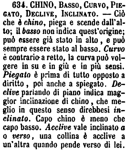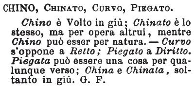 | Chino, Chinato, Curvo, Piegato - Chino è Volto in giù; Chinato è lo stesso, ma per opera altrui, mentre Chino può essere per natura. - Curvo s'oppone a Retto; Piegato a Diritto. Piegata può essere una cosa per qualunque verso; China e Chinata, soltanto in giù. G.F. [immagine] |