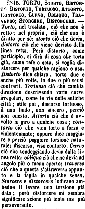 | Torto, Storto, Bistorto, Distorto, Tortuoso, Attorto, Contorto, Curvo, Obliquo, Traverso; Storcere, Distorcere - Torto, nel traslato, ciò che non è retto; nel proprio, ciò che non è diritto per sè; storto ciò che devia, distorto ciò che viene deviato dalla linea retta. Però distorto, come participio, si dirà di cosa che torta già, come refe o seta, si voglia distorcere per qualche ragione o uso. Bistorto dice chiaro, torto due e anche più volte, in due o più sensi contrarii. Tortuoso ciò che cambia direzione descrivendo varie curve irregolari, come le vie delle antiche città; stile poi, discorso tortuoso, il non lindo, non sincero, perciò non onesto. Attorto ciò che è avvolto in giro a qualche cosa; contorto ciò che vien torto a forza e violentemente; oppure dice maggiore e perciò peggiore torsione naturale; discorso, viso contorto. Curvo ciò che tondeggiando devia dalla linea retta: obliquo ciò che ne devia ad angolo più o meno aperto; traverso ciò che a questa s'attraversa appunto e la taglia in qualche senso. Storcere e distorcere indicano ambedue il levare una torsione già data; però distorcere mi sembra significare azione più lenta ma più perseverante. [immagine] |