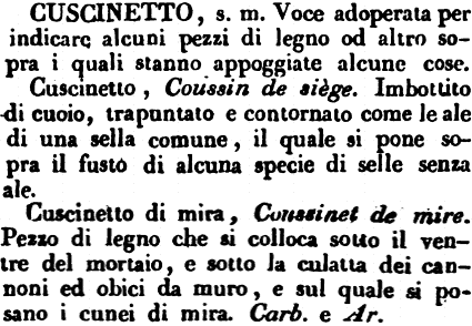 Cuscinetto, Coussin de siège. Imbottito di cuoio, trapuntato e contornato come le ale di una sella comune, il quale si pone sopra il fusto di alcuna specie di selle senza ale. Cuscinetto di mira, Coussinet de mire. Pezzo di legno che si colloca sotto il ventre del mortaio, e sotto la culatta dei cannoni ed obici a muro, e sul quale si posano i cunei di mira. Carb. e Ar. [immagine] |