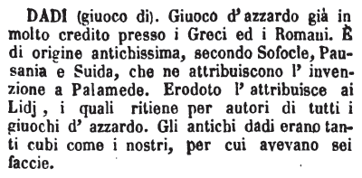 | Dadi (giuoco di) - Giuoco d'azzardo già in molto credito presso i Greci ed i Romani. E' di origine antichissima, secondo Sofocle, Pausania e Suida, che ne attribuiscono l'invenzione a Palamede. Erodoto l'attribuisce ai Lidj, i quali ritiene per autori di tutti i giuochi d'azzardo. Gli antichi dadi erano tanti cubi come i nostri, per cui avevano sei faccie. [immagine] |