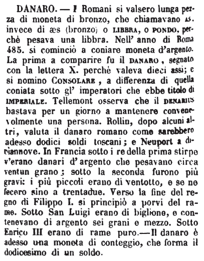 | Danaro - I Romani si valsero lunga pezza di moneta di bronzo, che chiamavano as, invece di æs (bronzo) o libbra, o pondo, perchè pesava una libbra. Nell'anno di Roma 485. si cominciò a coniare moneta d'argento. La prima a comparire fu il danaro, segnato con la lettera X. perchè valeva dieci assi; e si nomino Consolare, a differenza di quella coniata sotto gl'imperatori che ebbe titolo di imperiale. Tellemont osserva che il denarius bastava per un giorno a mantenere convenevolmente una persona. Rollin, dopo alcuni altri, valuta il danaro romano come sarebbero adesso dodici soldi toscani; e Neuport a diciannove. In Francia sotto i re della prima stirpe v'erano danari d'argento che pesavano circa ventun grano; sotto la seconda furono più gravi: i più piccoli erano di ventotto, e se ne fecero sino a trentadue. Verso la fine del regno di Filippo I. si principiò a porvi del rame. Sotto San Luigi erano di biglione, e contenevano di argento sei grani e mezzo. Sotto Enrico III erano di rame puro. - Il danaro è adesso una moneta di conteggio, che forma il dodicesimo di un soldo. [immagine] |
