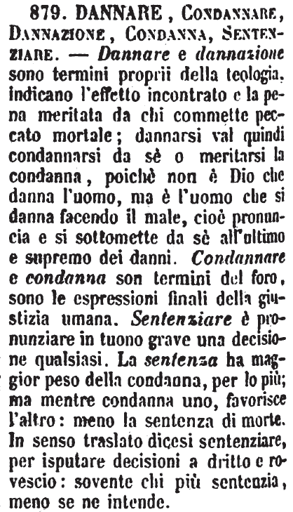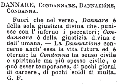 | Dannare, Condannare, Dannazione, Condanna - Fuori che nel verso, Dannare è della sola giustizia divina che punisce con l'inferno i peccatori; Condannare è della giustizia divina e dell'umana. - La Dannazione concerne anch'essa la vita futura ed è eterna; la Condanna ha senso civile e spirituale ma più spesso civile, e può esser temporanea, di pochi giorni di carcere, di pochi soldi di multa. G. F. [immagine] |