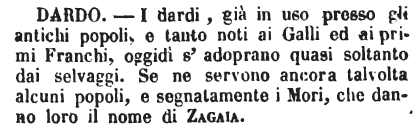 | Dardo - I dardi, già in uso presso gli antichi popoli, e tanto noti ai Galli ed ai primi Franchi, oggidì s'adoprano quasi soltanto dai selvaggi. Se ne servono ancora talvolta alcuni popoli, e segnatamente i Mori, che danno loro il nome di Zagaia. [immagine] |