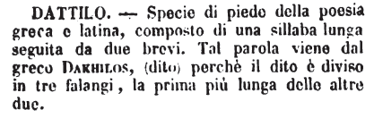 | Dattilo - Specie di piede della poesia greca e latina, composto di una sillaba lunga seguita da due brevi. Tal parola viene dal greco Dakhilos, (dito) perché il dito è diviso in tre falangi, la prima più lunga delle altre due. [immagine] |