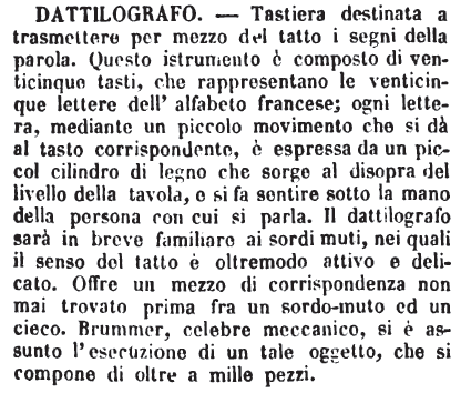 | Dattilografo - Tastiera destinata a trasmettere per mezzo del tatto i segni della parola. Questo istrumento è composto di venticinque tasti, che rappresentano le venticinque lettere dell'alfabeto francese; ogni lettera, mediante un piccolo movimento che si dà al tasto corrispondente, è espressa da un piccol cilindro di legno che sorge al disopra del livello della tavola, e si fa sentire sotto la mano della persona con cui si parla. Il dattilografo sarà in breve familiare ai sordi muti, nei quali il senso del tatto è oltremodo attivo e delicato. Offre un mezzo di corrispondenza non mai trovato prima fra un sordo-muto ed un cieco. Brummer, celebre meccanico, si è assunto l'esecuzione di un tale oggetto, che si compone di oltre a mille pezzi. [immagine] |