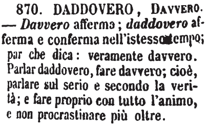 | Daddovero, Davvero, Per da vero - Daddovero afferma un po' più, dice il Tommaseo; ma Davvero è il più comunemente usitato. Io direi piuttosto che Daddovero afferma, ma l'usarlo è pedanteria. - Davvero afferma e conferma. - Per davvero afferma e conferma con più efficacia. Spesso Davvero e Per davvero significano cosa fatta con fermo proposito e non per pura dimostrazione. - «Ora comincia a dir davvero,» cioè si è messo all'opera con tutto l'ardore. - «Non so se dice per celia o per davvero.» [immagine] |