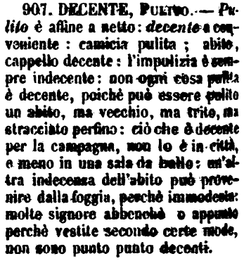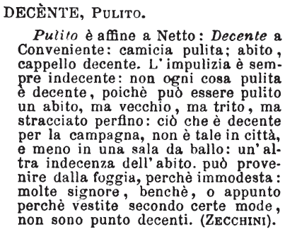 | Decente, Pulito - Pulito è affine a netto: decente a conveniente: camicia pulita; abito, cappello decente: l'impulizia è sempre indecente: non ogni cosa pulita è decente, poichè può essere pulito un abito, ma vecchio, ma trito, ma stracciato perfino: ciò che è decente per la campagna, non lo è in città, e meno in una sala da ballo: un'altra indecenza dell'abito può provenire dalla foggia, perchè immodesta: molte signore abbenchè o appunto perchè vestite secondo certe mode, non sono punto punto decenti. [immagine] |