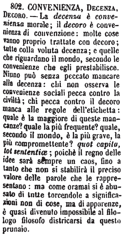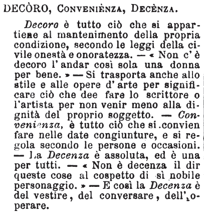 | Decoro, Convenienza, Decenza - Decoro è tutto ciò che si appartiene al mantenimento della propria condizione, secondo le leggi della civile onestà e onoratezza. - « Non c'è decoro l'andar così sola una donna per bene. » - Si trasporta anche allo stile e alle opere d'arte per significare ciò che dee fare lo scrittore o l'artista per non venir meno alla dignità del proprio soggetto. - Convenienza, è tutto ciò che si convien fare nelle date congiunture, e si regola secondo le persone e occasioni. - La Decenza è assoluta, ed è una per tutti. - « Non è decenza il dir queste cose al cospetto di sì nobile personaggio. » - E così la Decenza è del vestire, del conversare, dell'operare. [immagine] |