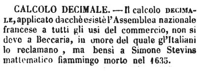 | Calcolo decimale - Il calcolo decimale, applicato dacchè esistè l'Assemblea nazionale francese a tutti gli usi del commercio, non si deve a Beccaria, in onore del quale gl'Italiani lo reclamano, ma bensì a Simone Stevins mattematico fiammingo morto nel 1635. [immagine] |