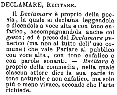 | Declamare, Recitare - Il Declamare è proprio della poesia, la quale si declama leggendola o dicendola a voce alta e con tono enfatico, accompagnandola anche col gesto; ed è preso dal Declamare generico (ma non al tutto dell'uso comune) che vale Parlare al pubblico con voce alta, con tono enfatico e con parole sonanti. - Recitare è proprio della commedia, nella quale ciascun attore dice la sua parte in tono naturale e non enfatico, ma solo più o meno vivace, secondo che l'arte richiede. [immagine] |