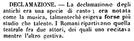 | Declamazione - La declamazione degli antichi era una specie di canto; era notata come la musica, talmentechè esigeva forse più studio che talento. I Romani ripartivano quella teatrale fra due attori, dei quali uno recitava mentre l'altro gestiva. [immagine] |