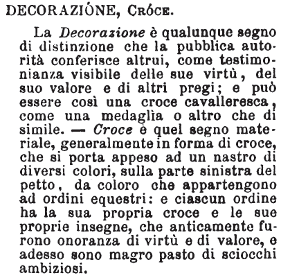| Decorazione, Croce - La Decorazione è qualunque segno di distinzione che la pubblica autorità conferisce altrui, come testimonianza visibile delle sue virtù, del suo valore e di altri pregi; e può essere così una croce cavalleresca, come una medaglia o altro che di simile. - Croce è quel segno materiale, generalmente in forma di croce, che si porta appeso ad un nastro di diversi colori, sulla parte sinistra del petto, da coloro che appartengono ad ordini equestri: e ciascun ordine ha la sua propria croce e le sue proprie insegne, che anticamente furono onoranza di virtù e di valore, e adesso sono magro pasto di sciocchi ambiziosi. [immagine] |