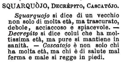 | Squarquojo, Decrepito, Cascatojo - Squarquojo si dice di un vecchio non solo di molta età, ma trascurato, debole, acciaccoso e spiacevole. - Decrepito si dice di colui che ha moltissima età, ma pure si mantiene in sanità. - Cascatojo è non solo chi ha molta età, ma chi è di salute malferma e male si regge in piedi. [immagine] |